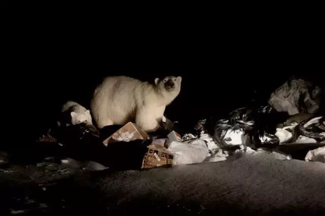(北极熊和她的幼崽在垃圾场寻找食物)