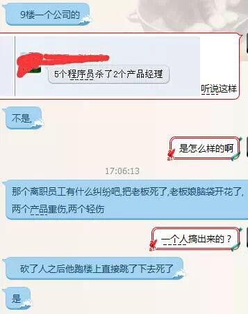 最近不断有新闻报道程序员砍死产品经理,让还没有正式走入职场的我,感到人生艰难。下图就是发生在深圳南山的一个真实的故事: (图) 5个程序员砍死2个产品经理,据说是因为那两个产品经理没事乱改需求。。。(我表示PM们以后改需求要非常慎重)