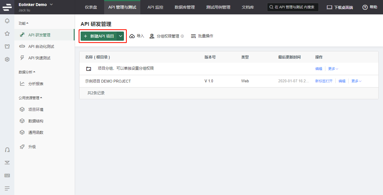 在 Eolinker API研发管理平台 中,所有的 API 都是以项目的方式进行妥善管理,因此我们首先需要创建一个 API 管理项目。