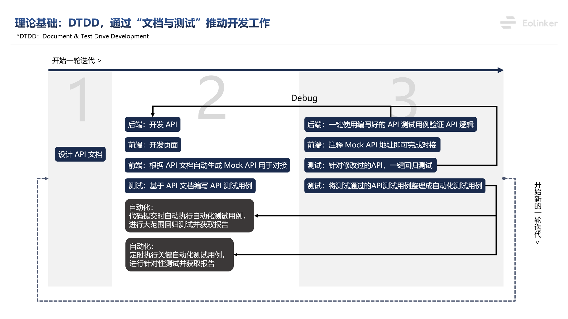 以上两种开发方式进行结合后就是 Eolinker API研发管理平台 的设计理念:文档与测试驱动开发(DTDD)。简单地说就是: