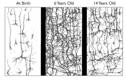 婴儿出生前2年,沟回形成的最快,因为大脑要处理如此多全新的基础信息 - 语言、温度、颜色、声音、气温、质地、因果关系等。2岁的婴儿大脑,有成人大脑两倍的沟回数目。这些形成的沟回用的多的会变的越来越粗,而不用的则会慢慢消失。