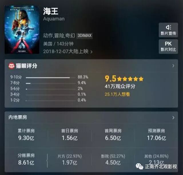 入冬以来,国内电影市场也是乎进入了严冬,冷冷清清的。除了《无名之辈》给我们寒冷的日子带来了些许欢乐和笑声,没有一部电影能让观众打起精神。近日,终于迎来了一部好莱坞大制作电影《海王》,截止12月13日晚,上映7天,《海王》在国内院线狂揽9.3亿的总票房,牢牢占据院线单日票房冠军的宝座。综合票房占比达到了79.5%左右,排片占比高达56.5%左右,碾压同期上映的其他电影。