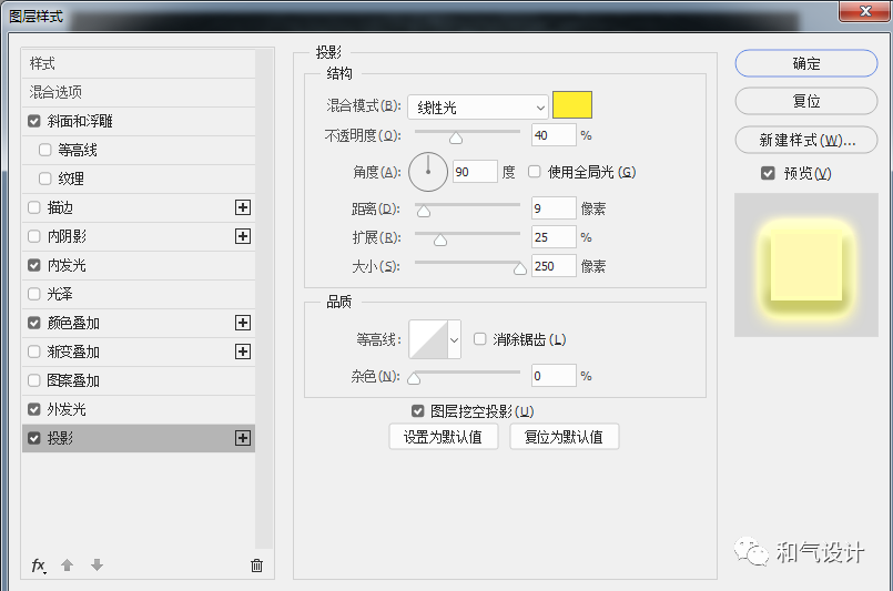 文字输入调整好以后,下面开始关键步骤了!做霓虹效果主要还是要是用我们混合选项里面的属性哦。红色框框款框选的属性就是我们需要调整的属性,需要注意的是在调整的时候,内发光、外发光和投影的混合模式我们需要修改为线性光,颜色内发光和外发光的颜色一样,投影饱和度更高一些,文字本身颜色饱和度更低一些。其他的可以参考我上图的数据调整。