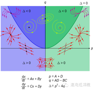 而这个平面的横轴和纵轴就代表这一矩阵特征值的实部和虚部。 当系统的参数变化, 表现为系数矩阵的特征值在这一平面上的运动。 特征根的实数部分的正负决定系统是趋于稳定的定点还是发散。 为负的话你将收敛到到她身边, 为正你将远离她而去。 而如果实数部分为0 ,特征根只有虚部,那么系统意味着系统既要远离定点又出不去她的引力范围, 最后就成围绕她绕转,即振动的情况。虚部的正负决定系统围绕定点转动的方向,在此不多叙述。