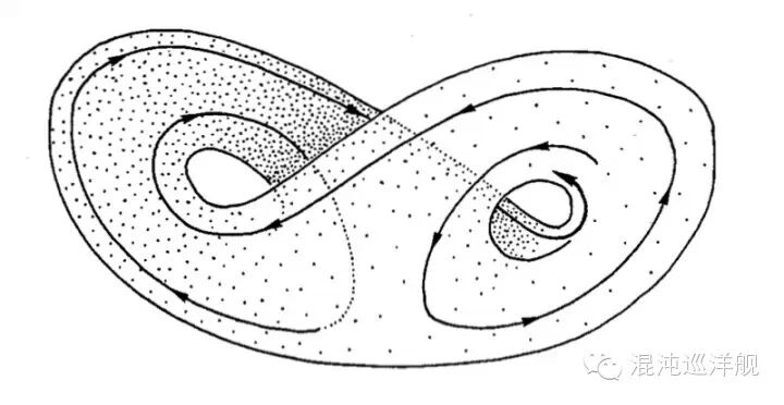 图为洛伦兹吸引子,由洛伦兹方程确定的三维系统具有两个吸引中心(定点),系统围绕两个定点旋转,形成极为复杂不可捉摸的轨道,形如扇扇翅膀的蝴蝶。