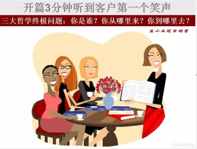 我曾仔细研究过客户聊天,发现与陌生客户交流前5分钟非常关键,所以我要求接受培训的同学,见到陌生客户从说第一句话开始,3分钟必须听到客户第一个笑声,客户笑得越早,我们谈话效果越好,第一印象越好!