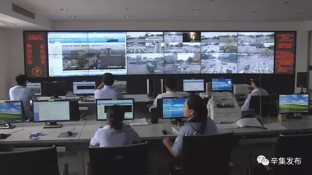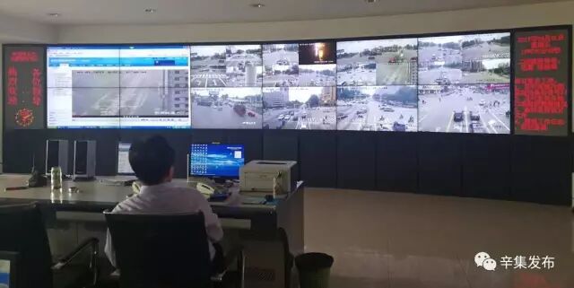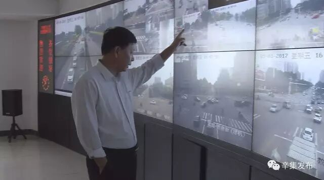 在交警指挥中心的监控大屏幕上,邸义书记认真查找无苫盖渣土车。