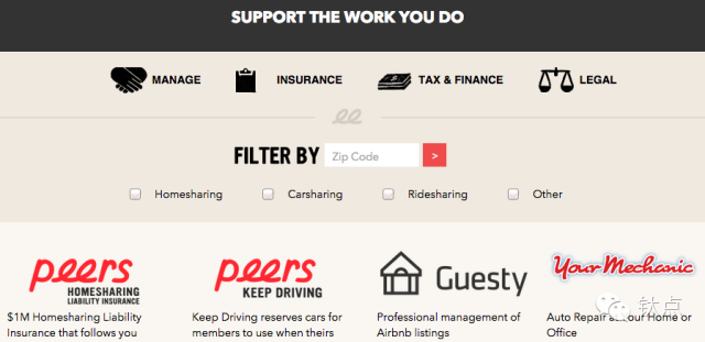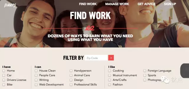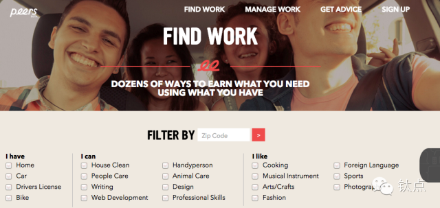 如配图所示, 以“MAKING THE SHARING ECONOMY WORK FOR YOU”为口号的peers.org旗下FIND WORK就是其中代表,它是一个分享经济相关平台的平台。