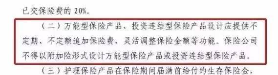 文件明确规定万能险、投连险只能作为一个独立险种销售,不能附加了。对于附加万能险账户的保险产品,这将是一个非常大的打击,目前市面上中小险企的主打产品当中,就有不少是以“一个主险+万能型附加险”形式存在的。