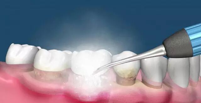 用高压气流把一种固体的盐类喷到牙齿表面,去除牙齿表面和缝隙的污渍。