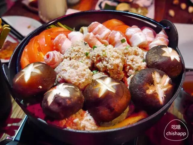 满满的一个锅里,放着肉丸、五花肉片、番茄、香菇等等,可以说是极有诚意。开火后不久,锅子开始发出“咕嘟咕嘟”的声音,肉丸吸饱了汤汁,番茄融入汤中,开吃!