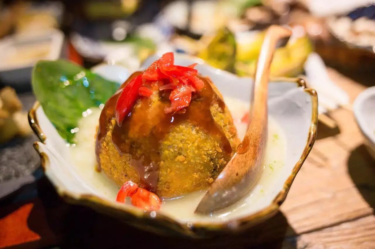 土豆球的造型十分可爱,很像大名鼎鼎的淮扬狮子头。外皮焦脆,里头裹着酥软细腻的土豆泥,吃到深处又能吃到一些土豆块,丰富了口感。土豆球底部的酱汁听说还加入了菠菜汁,十分新奇。