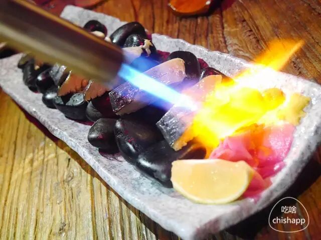 火烧青花鱼是店内的招牌,身穿忍者服饰的店员会现场为你发功制作佳肴。在高温火焰的喷烧之下,青花鱼慢慢渗出了自身的油脂,并伴随着迷人的香气。