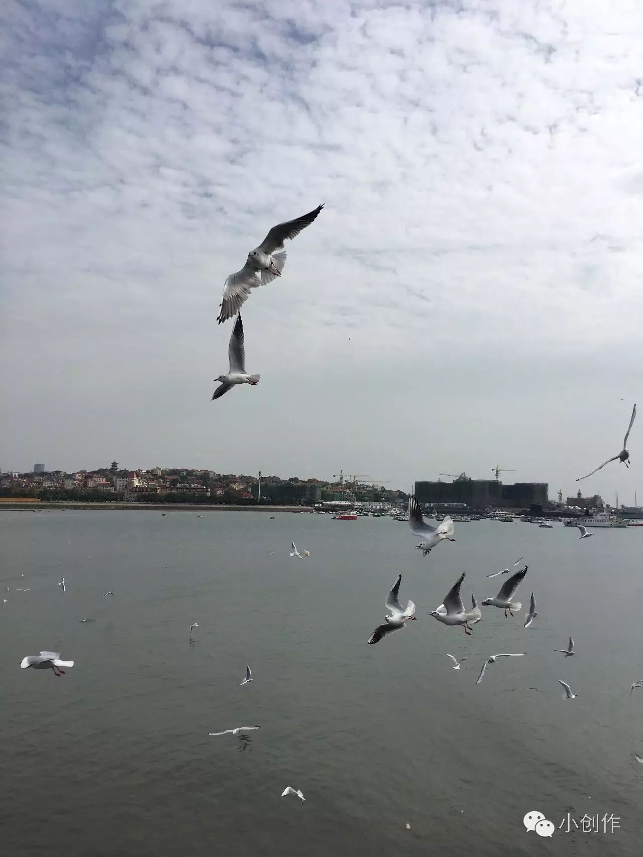 栈桥边上,有人给海鸥喂食。有没有发现一个现象,前面那几只海鸥都是往一个方向飞的,都是从右往左飞,如果你再仔细观察一下的话,你会发现远处的几只海鸥都是从左往右飞。