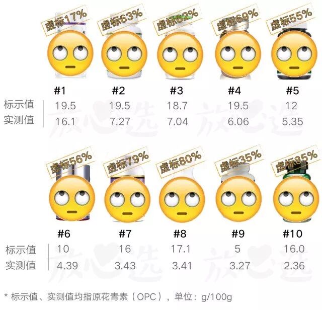 一共测了13个国内(含正规进口)品牌,10个虚标原花青素含量,这概率、这手气、这命……原花青素实测值和标示值的误差竟然普遍超过30%,有两款更达到80%,胆儿是不是有点肥?!