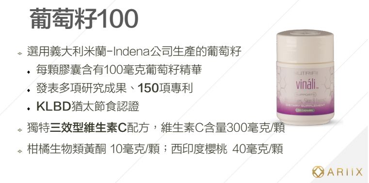 葡萄籽100 (Vináli)所採用的葡萄籽萃取物由一家设于米兰的家族公司生产。他们凭藉近一个世纪的经验及严谨的质量检测,单就检验过程而言,他们便对近350种农药进行筛选,远超现行规定只筛选34种的最低要求,务求提供令您放心服用的高质量产品。