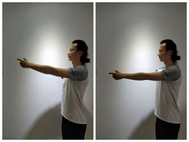 双手前平举呈手枪姿势。想象手臂组成的三角形所在平面与水平面平行。W摆出来的手臂,类似下图左边这样的,而比较良好的姿势,是下图右边这样的。可以看出左边明显手臂上举了。