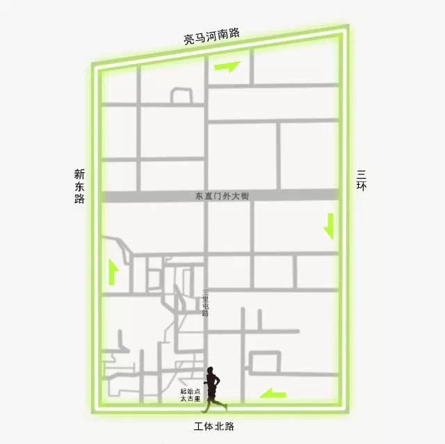 从优衣库出发,向西到新东路口往北,到亮马河往东至三环,随后沿着三环一路向南,到长虹桥往西回到起点优衣库。