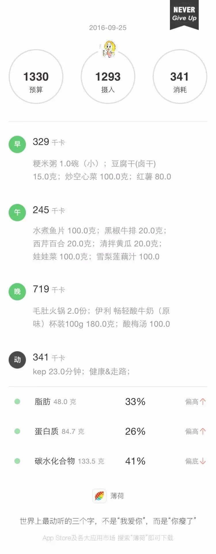 很久之前就下载了这个软件,但是一直没用起来,内容太繁琐的,看着就头晕了。这次一并用它,是因为keep的数据管理不够齐全,而薄荷可以记录每天吃的东西,和记录身体数据。刚开始几天我觉得,这TM太无聊了,后来慢慢习惯了,饭后几分钟就记录下来了。而且我觉得记录到20多天,大致了解自己的饮食规律,就不用这么刻板了。