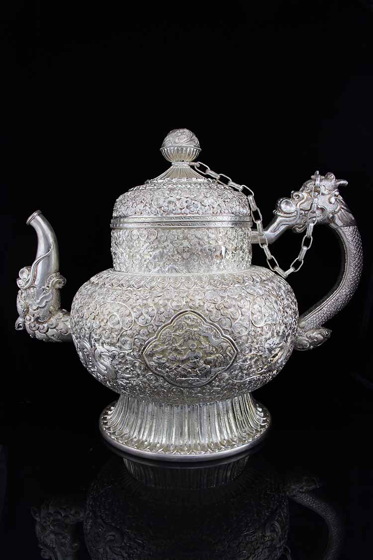 这款传统藏式浮雕精刻作品酥油壶由云南艺术学院特聘专家,大理州民间工艺大师段六一大师制作;(图片由段六一大师授权发表)
