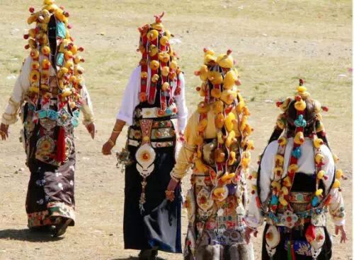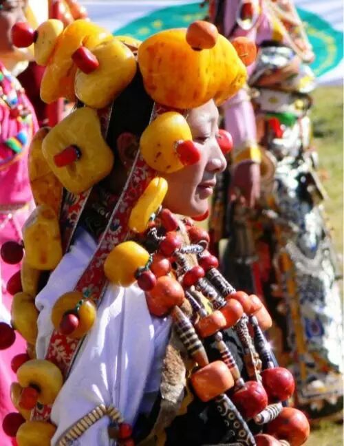 由于藏族是游牧民族,在长期的狩猎游牧的生活之中形成了将财物或贵重物品换成首饰佩戴在身上以便迁徙的习性,经过祖辈相传形成了我们今天所见的满身披挂的首饰佩戴形式。