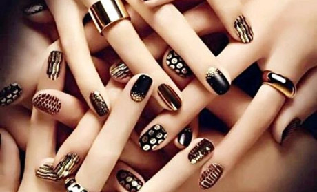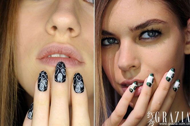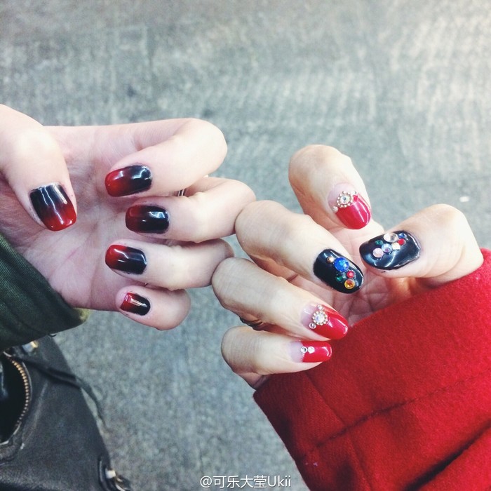 这个就纯粹是欧美风,不同于日韩的淑女甜美,欧美风总是那么的有个性,有着浓烈的个人色彩。像上图,两人采用了同样的不规则图案点缀指甲,求同存异,各有各的风采。