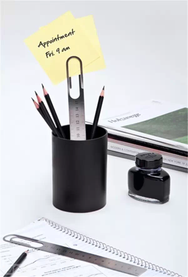 两个事物的结合总是能够产生新的事物,在设计中,无论功能还是形态它们都会发生改变或者说是进步。Cliptip Ruler是一个将回形针与尺子造型完美的结合在一起的产物,同时两种功能也被融合到一起,一点也不突兀。我们照旧可以用这把尺子进行测量和绘图,同时还可以作为便签夹来使用。