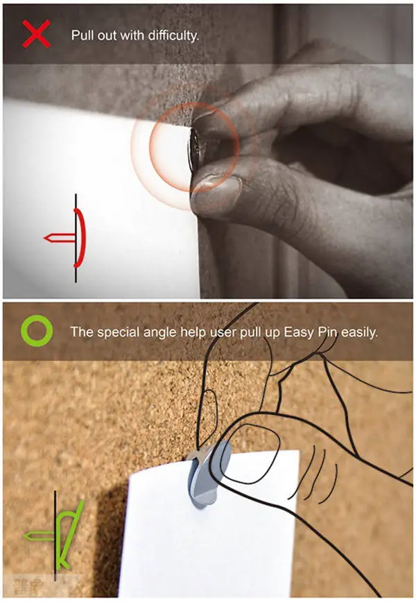 在办公或日常生活中,经常都会用大头钉便签、备忘、相片等固定到墙板上,传统大头钉有两个显而易见的缺点:需要在纸张上穿孔、以及钉上后难以起出来。融合了夹子与大头钉,设计师Lee Yin-Kai和Wang Szu-Hsin重新设计了一个更易于使用的大头钉Easy Pin,它可以在不损害纸张的前提下轻松固定和反复使用,并且容易起出、不易到处翻滚。