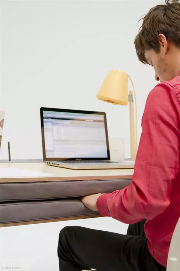 矛盾办公桌是法国设计师安娜的作品,设计师选用了木材与泡沫垫、两种特性相互矛盾的材料,即坚实的胶合板夹着两层舒适的软垫组成。这一创造性的组合既带来引人注目的视觉效果,也带来了更多使用可能:除了作为收纳之用,让文具、文件和办公用品都各得其所以外,你还可以直接在两块软垫中间插上一块木板扩展桌面空间,甚至在寒冷的冬天中,你也可以将双手插进软垫之中保暖。
