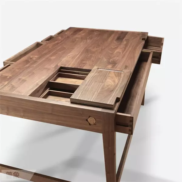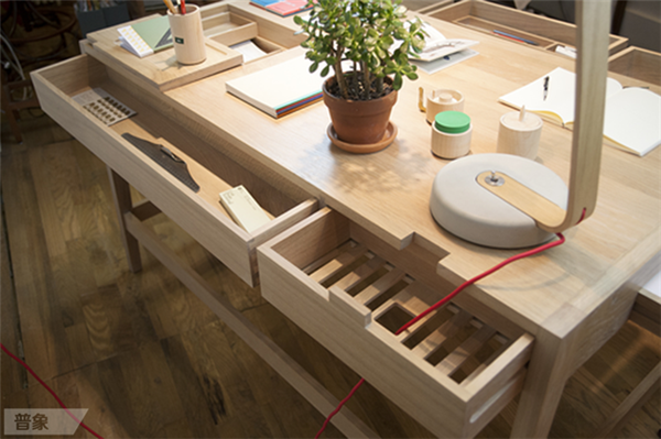采用实心橡木或核桃木制作,设计师旨在创建一个不仅干净优雅、同时也要小巧而实用的工作台 ,因此工作台的三个侧面和桌面上都设置了大小各异的功能抽屉,工作完毕,基本上桌面上的一切工作用具都能妥妥的收纳起来,让桌面完全的整洁、干净。