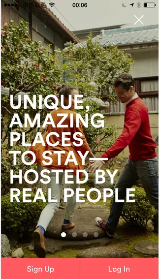 6.这个APP直观的看起来更像是一个袖珍型的网页,真实的背景图片与简短的文案相搭配。唯一欠缺的部分就是底部的登录注册按钮,与界面整体似乎有些格格不入,但不可否认的是,纯色块的确能在界面中引起用户的注意。