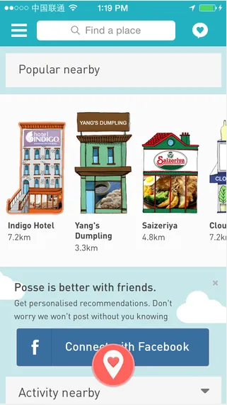 5.这是一个类似于大众点评的周边推荐类APP。与普通APP不同的是,这个APP将每一家商户的图标都转换成了具有商家特色的小图示,这样能让用户更加清晰的了解到该商家的特点,在APP的整体设计上也多了一些美感。