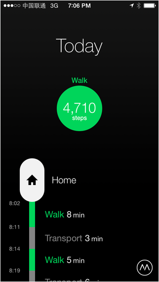 7.Moves是最近比较热门的一款运动类应用。绿色代表健康和积极向上,在黑色的衬托下,少量的荧光绿更是显得很出众。APP还使用了时间轴的计算方式,让用户一目了然,对自己的运动情况了如指掌。