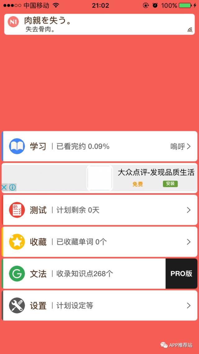 习惯用手机背单词的胖友们可以下载下来试一下,MOJi可以制定学习计划,根据计划学习及测试,每个单词有中日文解释和例句,当然有N1也会有2、3、4、5~还有MOJi辞書,后面会介绍。 有一点点广告,不过不影响的。