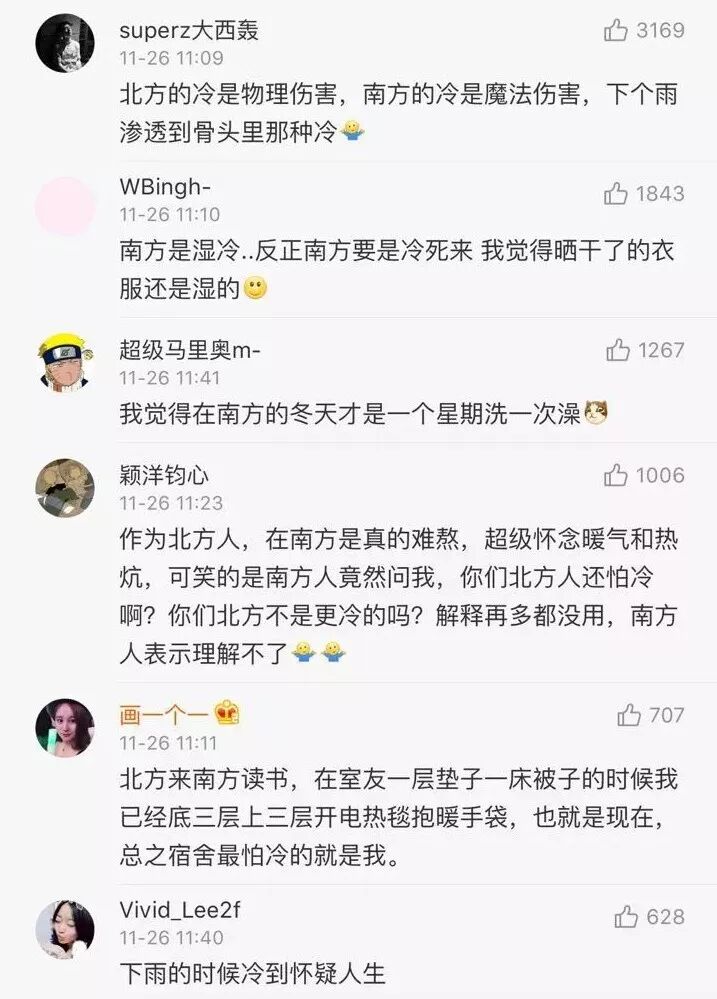我们可以看几条关于南方冬天的微博评论感受一下……