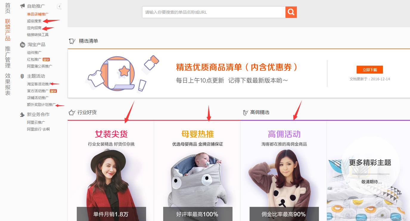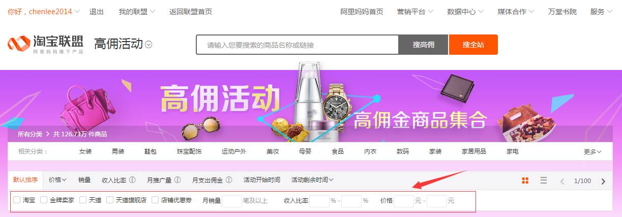 8、下面还有关于高佣产品的点击,也可以点击高佣的产品,也可以一点左面的超级搜索。点进去能看到更多产品。