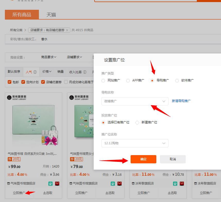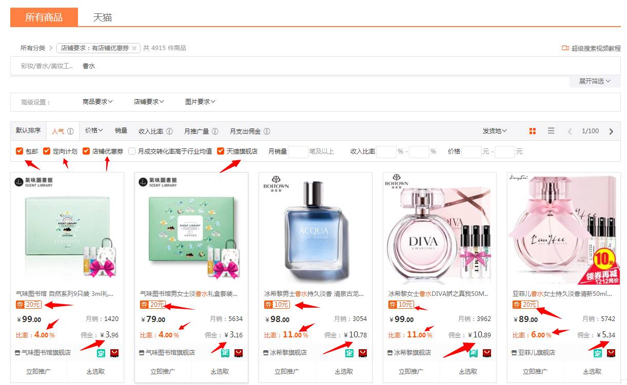 5、先选择一个产品我们来操作一次。搜索"香水"然后箭头所指都认真看下规律。