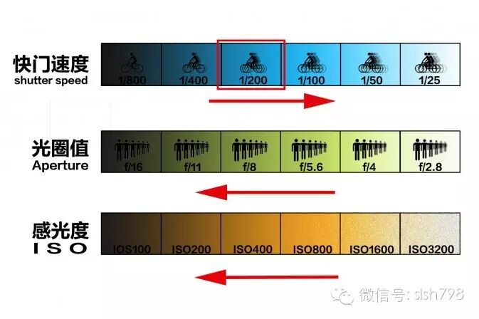想要保证曝光值不变,快门速度变慢(200到50),则需要缩小光圈(5.6到11)或是降低感光度(400到100),也可能是同时缩小光圈(5.6到8)并降低感光度(400到200)。其他两项变化与其同理。