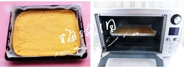 6.擀成烤盘大小,烤盘铺油纸,铺面团,进烤箱38度,再放入一杯热水,以保持湿度,最后发酵至2倍左右。