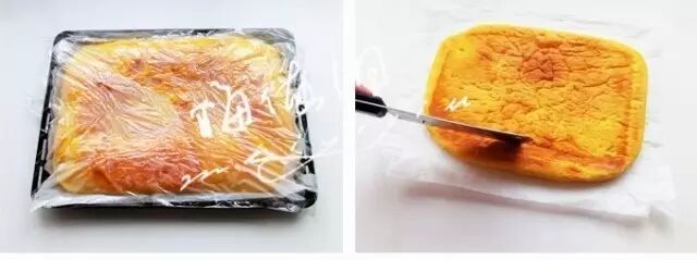 8.预热180度,中层上下火,烘烤15分钟左右,烤好的面饼带着烤纸拿出,盖上一层保鲜膜。