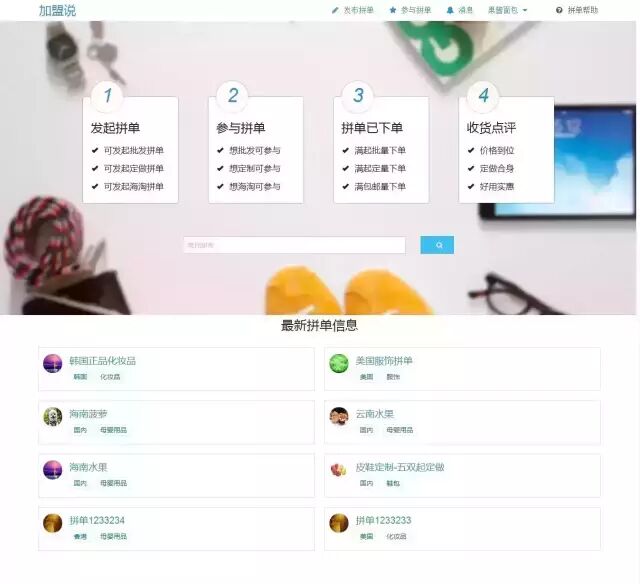 登录状态下:加盟说首页、参与拼单、消息、个人账户、拼单帮助