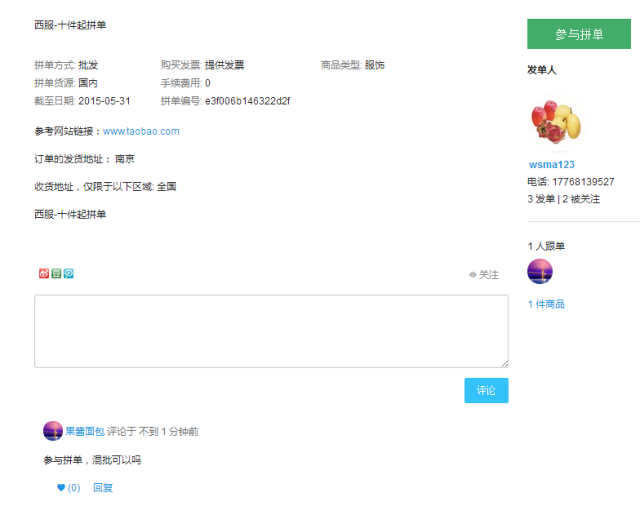 7.支持拼单关注,参与拼单,参与讨论,查看跟单人及跟单商品详细信息;还提供商铺链接,商品链接