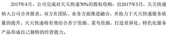 快报显示,2017年4月,苏宁云商完成对天天快递70%的股权收购,自2017年5月,天天快递纳入公司合并报表。