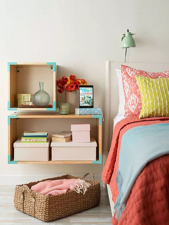 在狭小的空间里,杂乱是一个常数,你能找到的存储解决方案越多,你的房间就会越干净和平静。尝试一种策略,以获得宝贵的地点,以存放必需品:安装小立方体或矩形货架单元,以开放存储。没有门意味着不需要吞食空间来打开和关闭,安装在墙上的灯保持表面自由的书籍,眼镜,和更多。