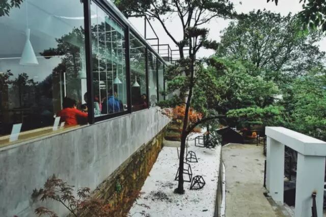 从重庆南山植物园出发,往南山寺方向走,穿过一片农家乐之后,在葱葱茏茏的树丛中,突然撞见一栋极具设计感的白色楼房。这里就是今年5月才开业的南之山书店。