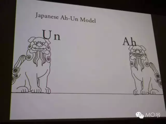 这个是日本神社前面放的,其实是两只狗,右边这个狗张嘴发的是AH的声音,左边的这个是闭嘴发的是UN这个音,AH就是发出这个信息,UN就是接收这个信息。日本觉得有AH、 UN这样的模式,交流的模式是最理想的,对方一张嘴我就理解你要说的内容,这是最理想的一种沟通的方式,可能没有什么科学的根据,但是举一个例子,在足球比赛当中,队员之间是用眼睛交流的,因为赛场上赛事的变化非常快,用语言叫你做什么已经来不及了,所以我们需要用眼睛交流,跟对方发出一些讯息,用眼睛交流实际上就是不需要语言的,刚才我说的内容,大家抛出一个空的容器,大家在这个容器当中迅速处理我们所得到的信息,也就是引出空的容器的概念。