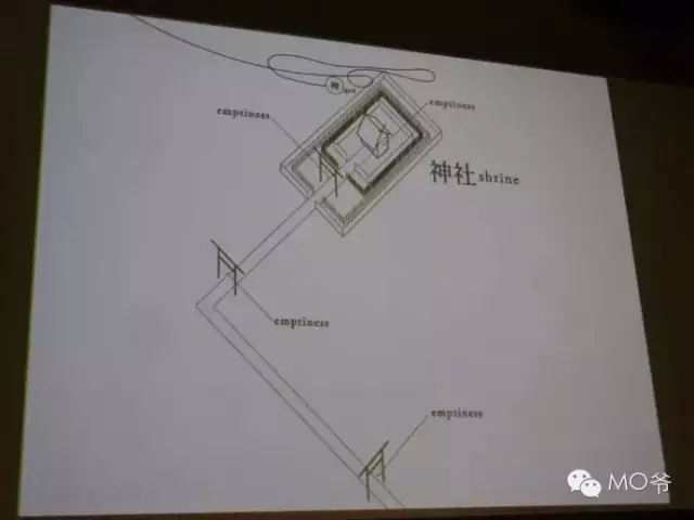 这个建筑在日本叫做鸟居,在中国相当于牌坊的建筑,中间也是空的,神可以从中间通过。也就是这样,有好几道鸟居,神是可以从这几个相当于门的构造当中通过去。人就从这一道一道鸟居下面通过去,到达神社前面,把自己的心愿说出去,空的容器又有可能神进来,人和神就会有沟通,这就是日本宗教的雏形,发源时候的一个想法。最初日本人所说的沟通的形式就是空的概念,一早就是有的。