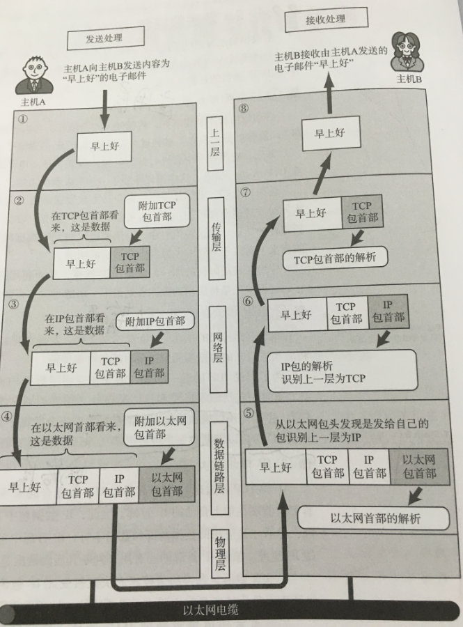 首先应用层将数据报文按照协议封装格式压缩然后传递给传输层、传输层通过协议将数据报封装为数据报段、然后传递给网络层,网络层将数据报段封装为数据包,并传递给数据链路层,数据链路层收到数据包,封装为数据帧,然后又将数据帧转比特流传递给物理层,物理层将比特流通过光或电信号发送给目标。
