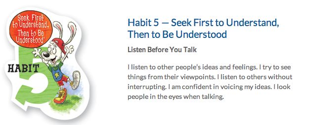 我仔细聆听别人的主意和情感。我努力从他人角度去理解问题。听别人说话的时候我不插嘴、不打扰。我很有信心说出我自己的主意。别人说话的时候,我直视他的眼睛。