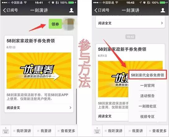 ❷点击一刻演讲微信下方查看更多按钮,菜单项选择“58到家代金券免费领”即可开始参与调查活动。